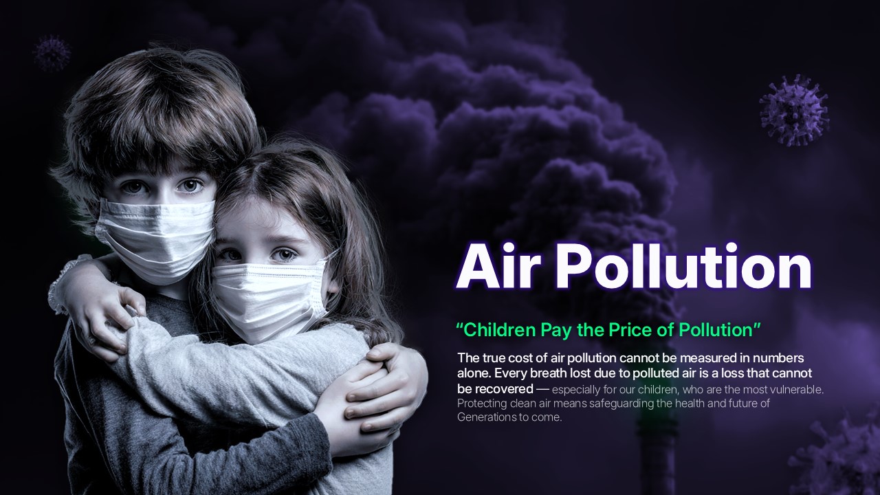 "어린이가 오염의 대가를 치른다"는 강력한 메시지로 대기 오염의 피해를 전달하는 슬라이드입니다. 마스크를 쓴 어린이 이미지로 미세먼지와 공기 오염이 미래 세대에 미치는 영향을 강조하며, 깨끗한 공기의 중요성과 다음 세대의 건강과 미래를 지켜야 한다는 메시지를 전달합니다. 대기질 개선, 보건 정책 발표에 효과적입니다.