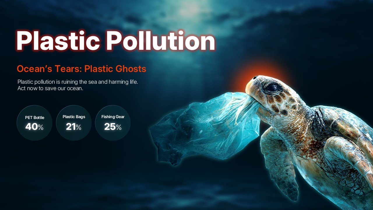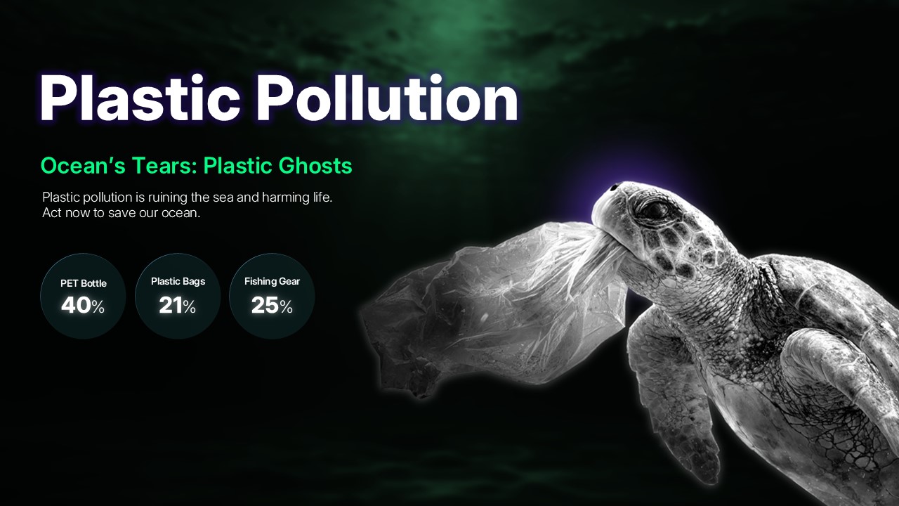 바다를 파괴하는 플라스틱 오염 문제를 바다거북 이미지로 표현한 슬라이드입니다. "Ocean's Tears: Plastic Ghosts" 메시지와 함께 구체적 데이터로 해양 오염의 심각성을 전달합니다. 해양 보호 캠페인, 플라스틱 저감 전략, 환경 교육 자료로 최적입니다.