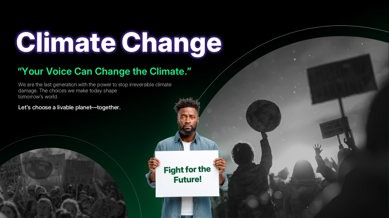"당신의 목소리가 기후를 바꿀 수 있다"는 강력한 메시지로 개인의 행동 변화를 촉구하는 슬라이드입니다. "Fight for the Future" 플래카드를 든 시위자 이미지로 기후 행동의 긴박함을 표현하며, 기후 정책 발표, 환경 운동, 시민 참여 캠페인에 효과적입니다. 함께 살기 좋은 지구를 만들자는 메시지를 전달합니다.