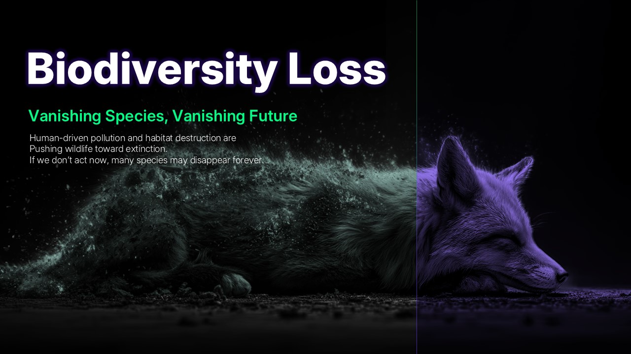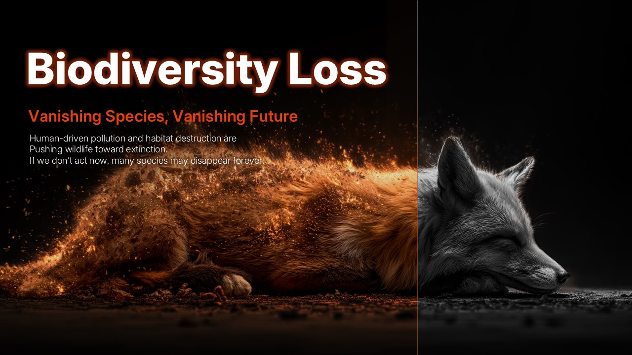 "사라지는 종, 사라지는 미래"라는 메시지로 생물다양성 손실의 심각성을 전달하는 슬라이드입니다. 인간에 의한 오염과 서식지 파괴로 야생동물이 멸종 위기에 처한 현실을 극적으로 표현하며, 지금 행동하지 않으면 많은 종이 영원히 사라질 것이라는 경고를 담고 있습니다. 생태계 보전, 종 보호 캠페인에 최적입니다.