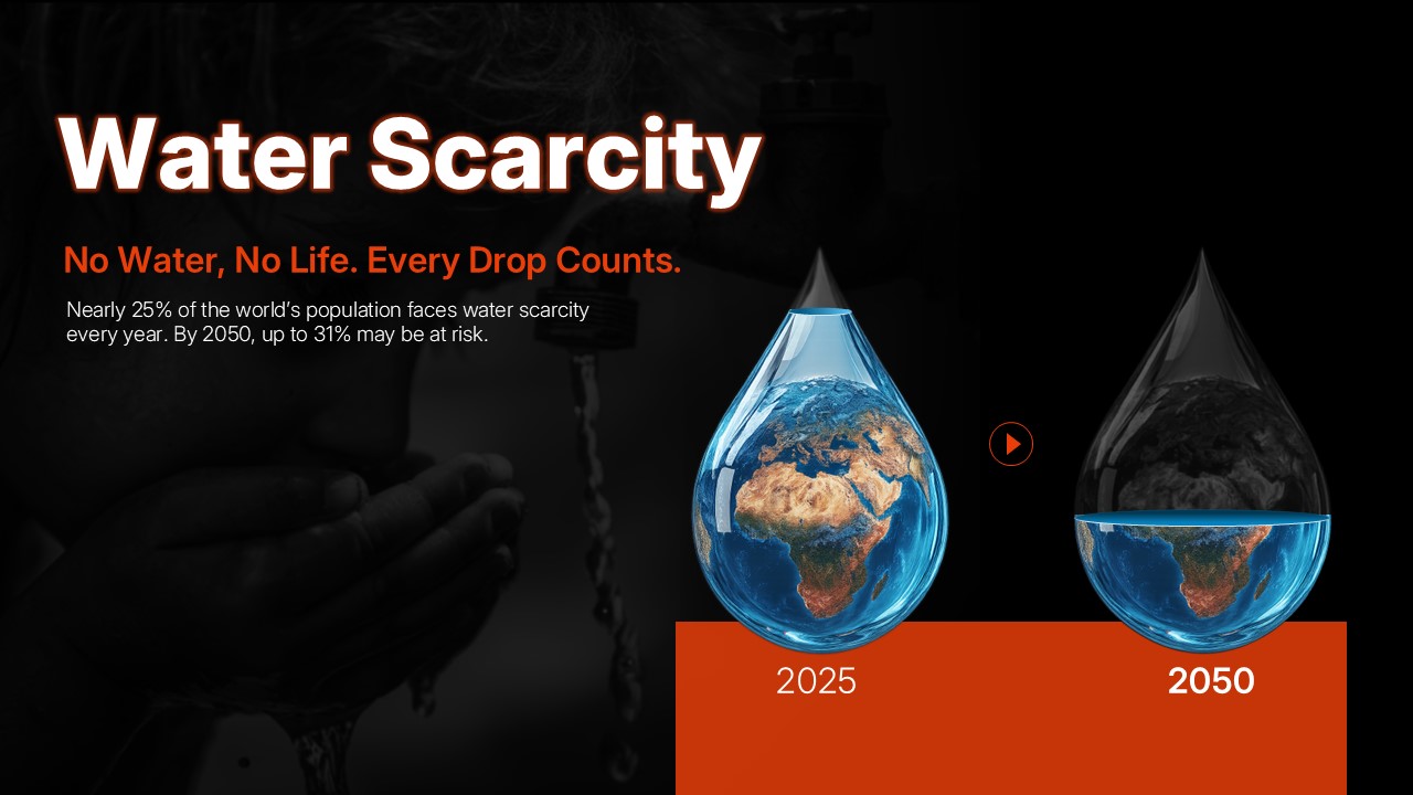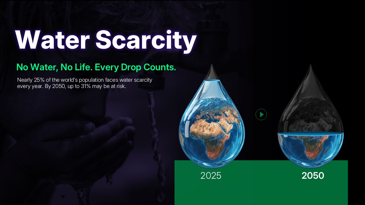 2025년과 2050년의 물 부족 위기를 비교하여 시각화한 슬라이드입니다. "No Water, No Life. Every Drop Counts." 메시지로 물의 소중함과 절약의 필요성을 강조하며, 전 세계 인구 25%가 물 부족에 직면한 현실을 데이터로 전달합니다. 수자원 관리, 환경 교육, 지속가능성 발표에 효과적입니다.