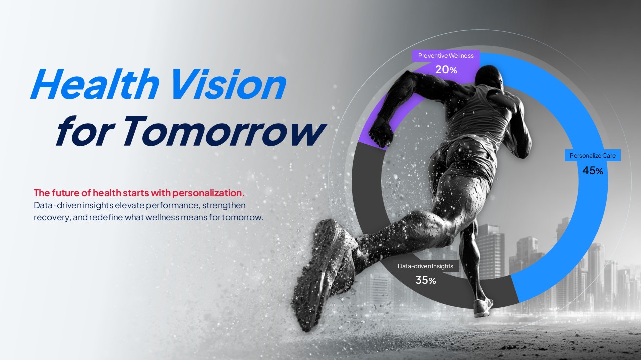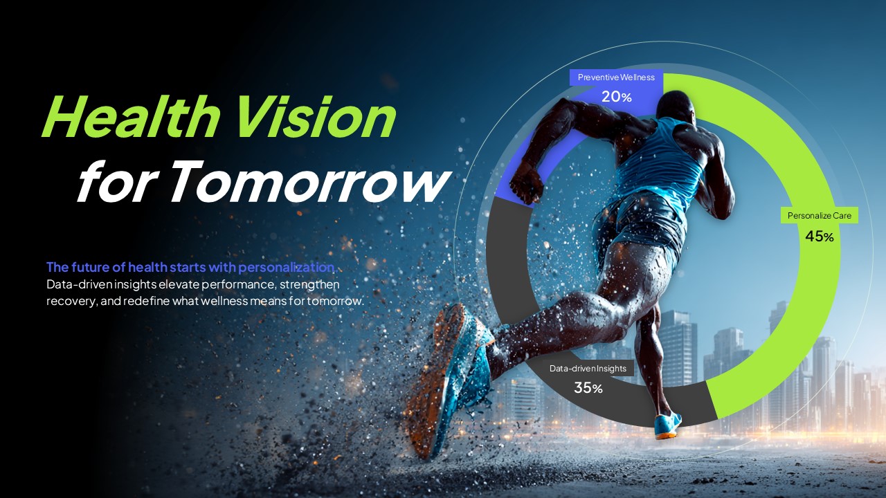 건강의 미래는 개인화에서 시작됩니다! 데이터 기반 인사이트가 퍼포먼스를 향상시키고, 회복을 강화하며, 내일의 웰니스가 무엇을 의미하는지 재정의합니다. 예방 웰니스 20%, 개인 맞춤 케어 45%, 데이터 기반 인사이트 35%의 구체적 비율로 미래 건강 관리의 방향성을 제시하며, 달리는 운동 선수의 역동적인 이미지가 목표 지향적 건강 관리를 상징합니다. 헬스케어 혁신, 디지털 헬스, 맞춤형 건강 관리에 관심 있는 분들께 최적입니다.