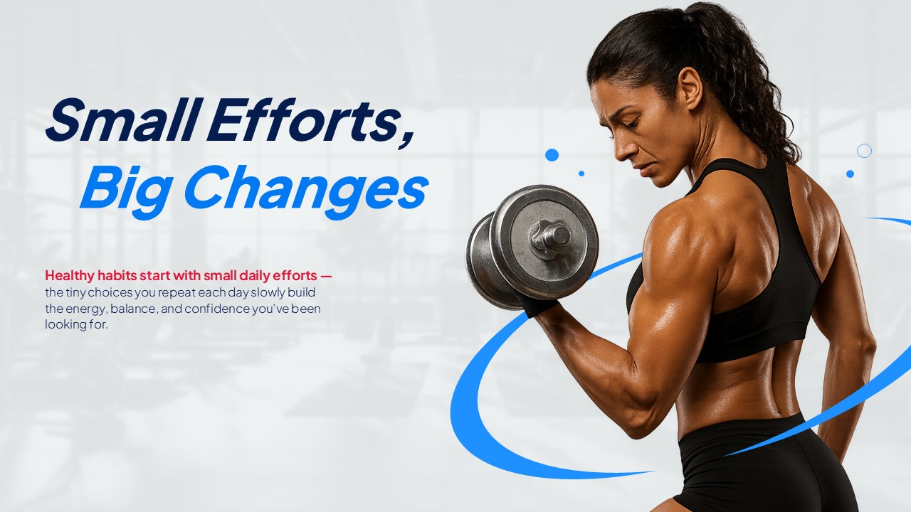 건강한 습관은 매일의 작은 노력에서 시작됩니다! 매일 반복하는 작은 선택들이 당신이 찾던 에너지, 균형, 자신감을 천천히 쌓아갑니다. 강력한 운동 이미지와 함께 꾸준함의 힘을 보여주며, 작지만 확실한 변화가 당신의 건강한 미래를 만듭니다. 운동 루틴, 피트니스 챌린지, 건강 습관 형성이 필요한 분들에게 동기부여가 되는 완벽한 슬라이드입니다.