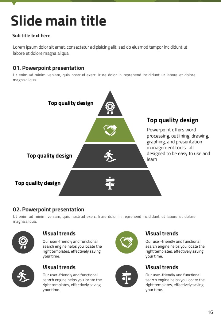 이 템플릿은 그린 색상의 삼각 패턴으로 구성되며, 정보 전달을 강조하는 심플한 디자인을 지향합니다. 세로형 구성으로 되어 있어, 제안서, 보고서, 프레젠테이션 등 다양한 문서 유형에 적합하게 활용할 수 있습니다. 기업 실무자, 스타트업 팀, 교육 및 연구 분야 종사자들에게 최적의 선택입니다.