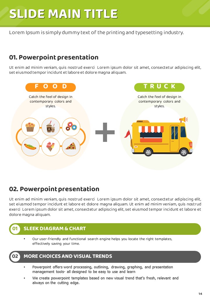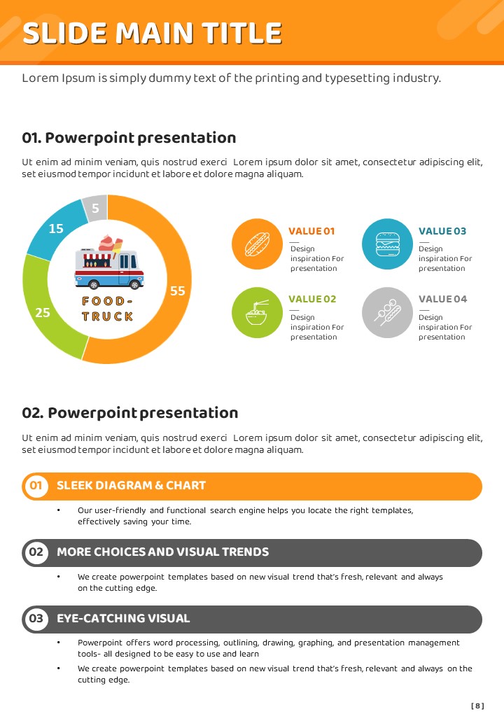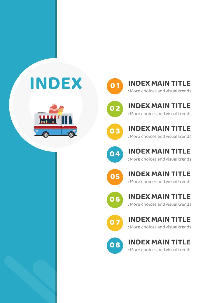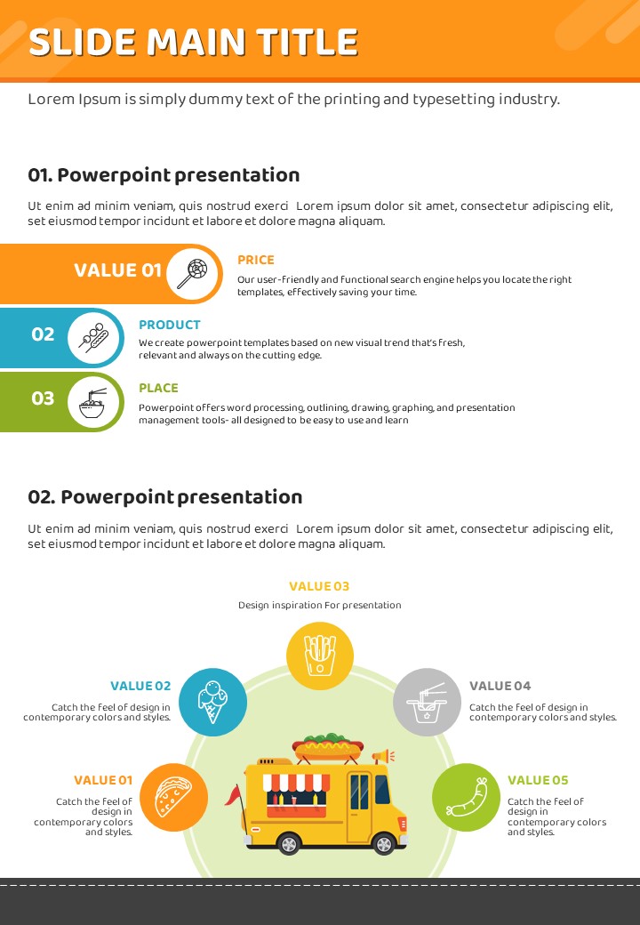 이 템플릿은 푸드트럭을 주제로 한 발표 자료 제작에 최적화된 세로형 PPT입니다. 주황색과 초록색의 조화로운 색상 배합이 돋보이며, 화려한 이미지와 직관적인 레이아웃이 특징입니다. 행사, 이벤트, 마케팅 제안서 등 다양한 상황에서 활용할 수 있으며, 특히 식음료 및 창업 관련 분야에서 큰 도움이 될 것입니다. 설계자, 음식 관련 스타트업, 마케팅 전문가에게 추천드립니다.