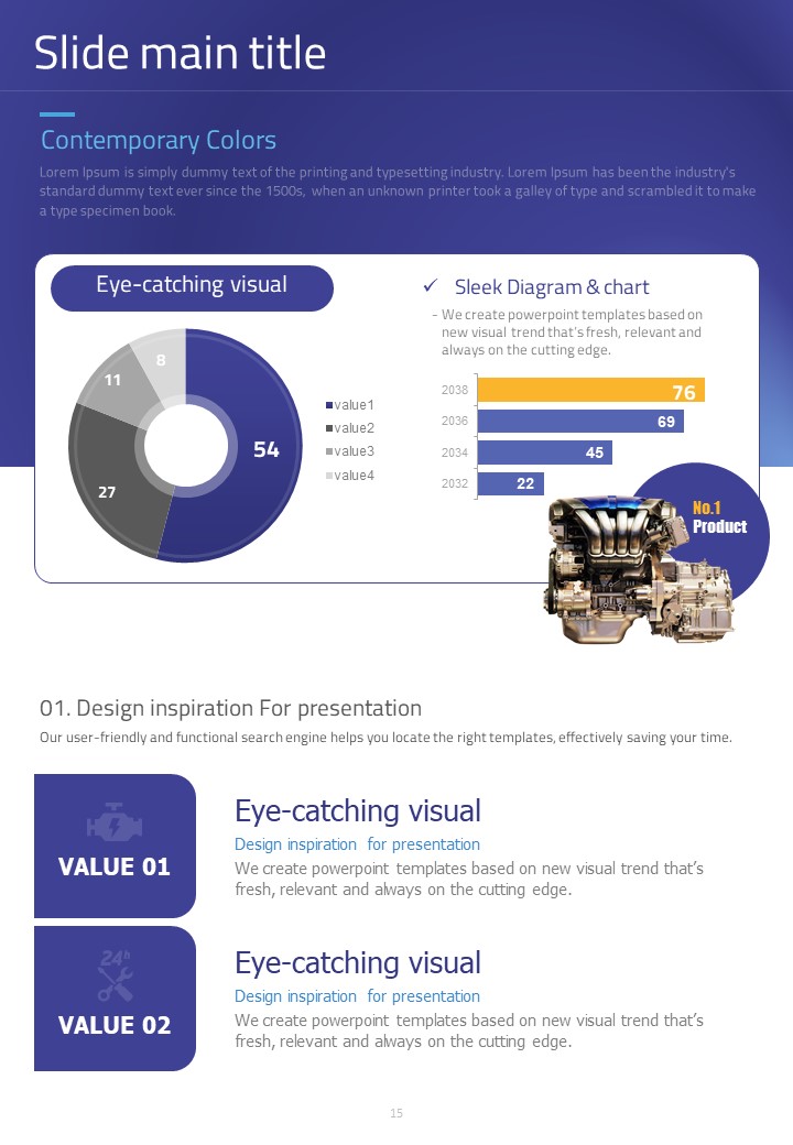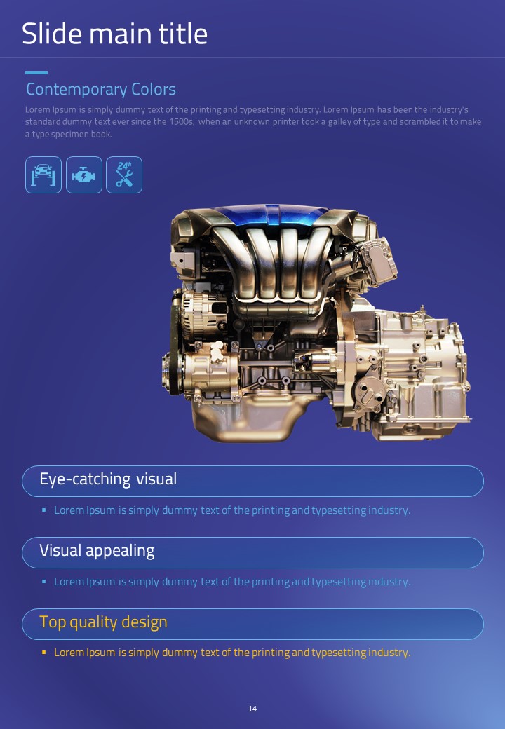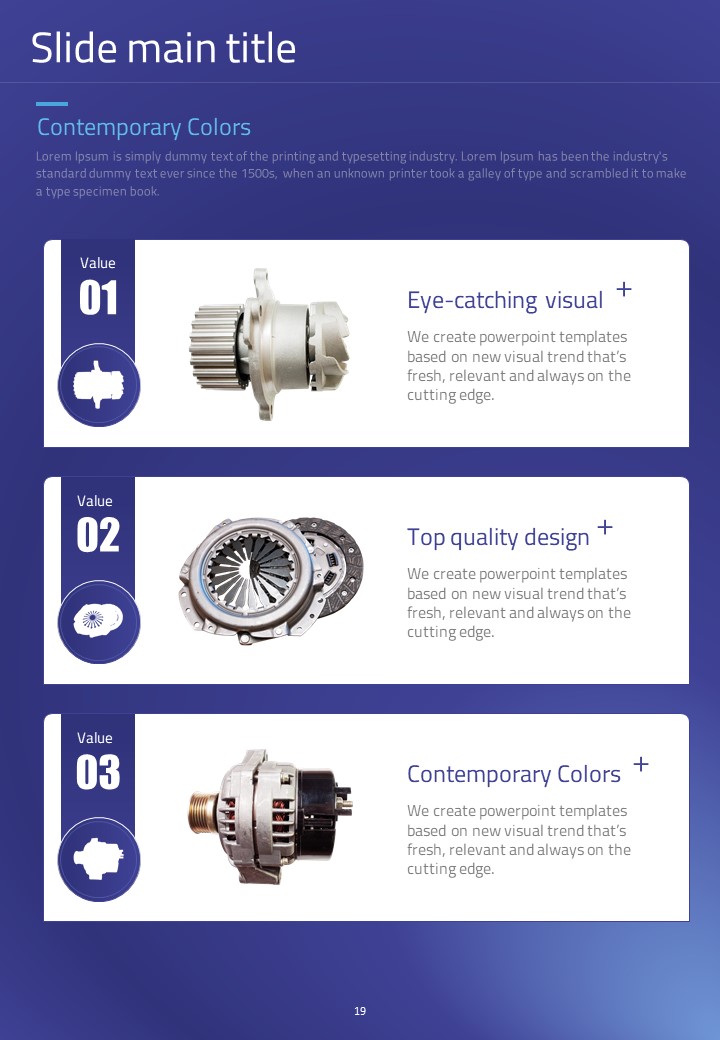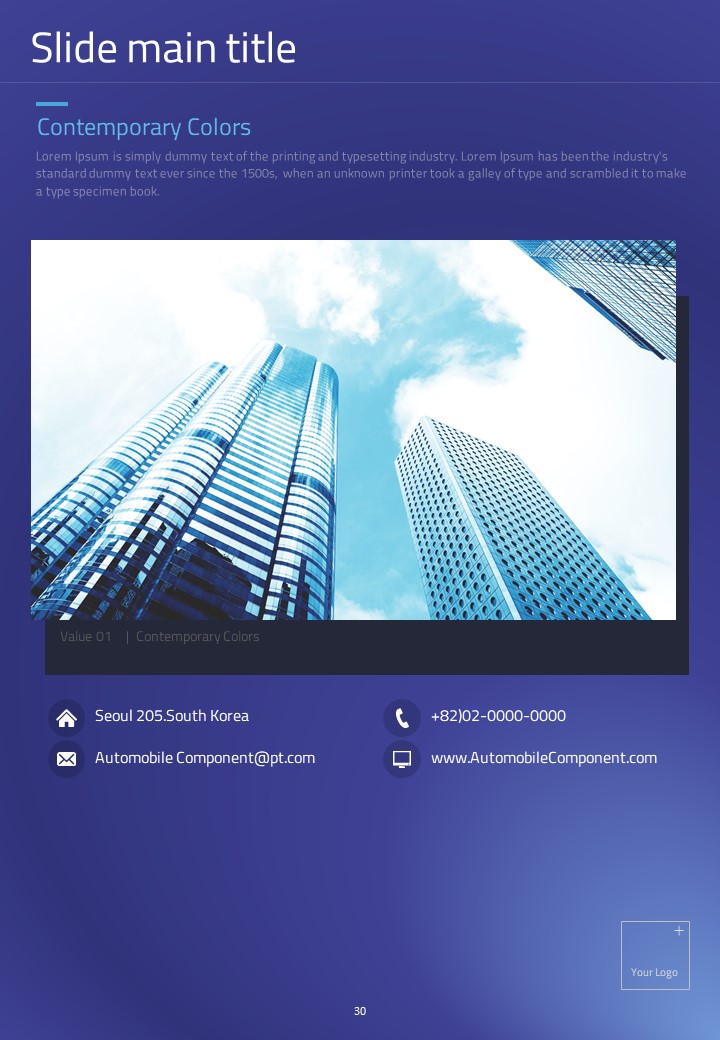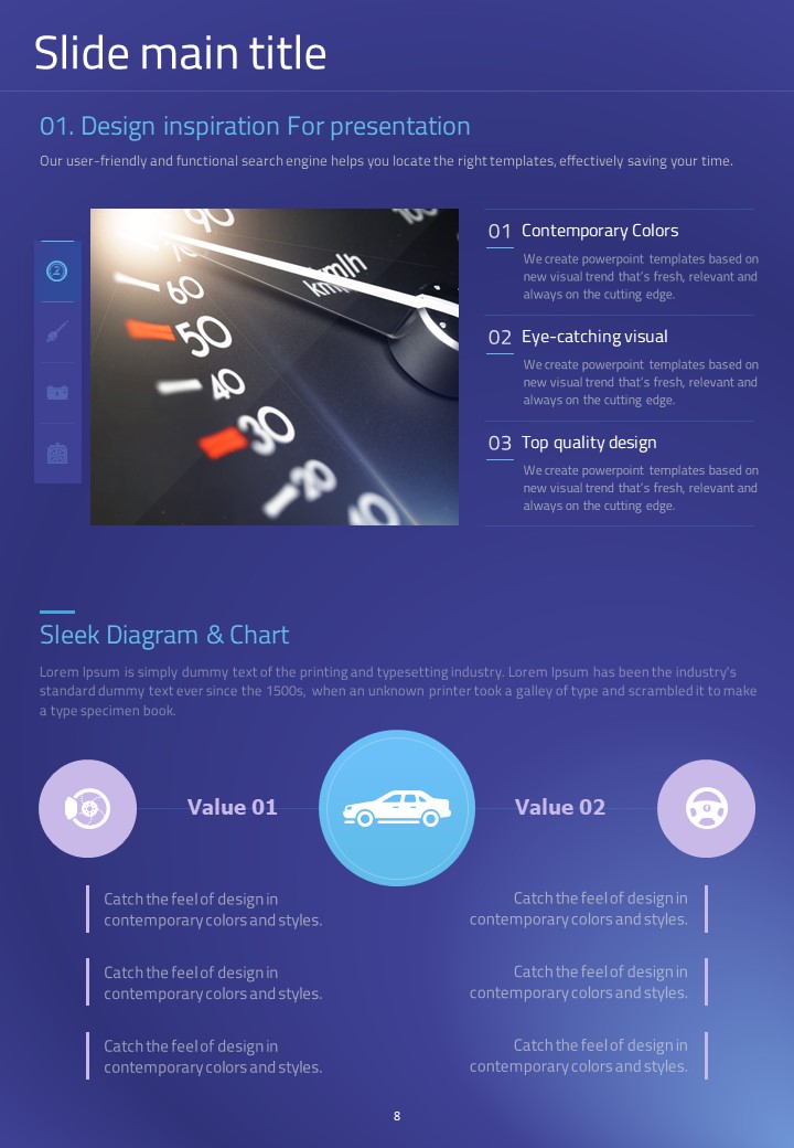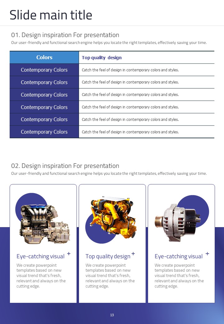 이 세로형 템플릿은 자동차 부품 관련 발표 자료를 위해 설계되었습니다. 모던한 보라색과 파란색 조합으로 시각적으로 매력적이며, 다양한 자동차 관련 데이터를 효과적으로 시각화하는 데 적합합니다. 자동차 산업의 전문가, 엔지니어 및 프로젝트 매니저에게 특히 추천되는 템플릿입니다.