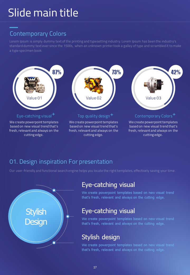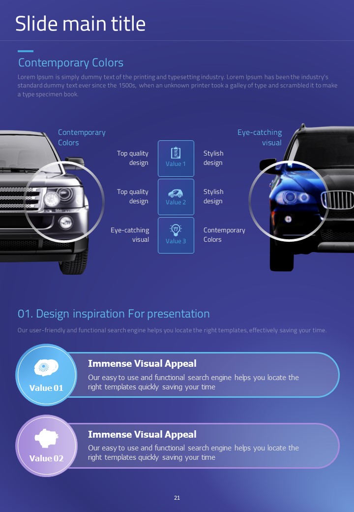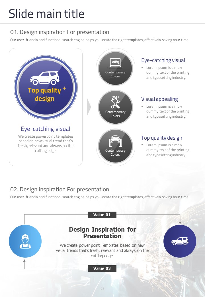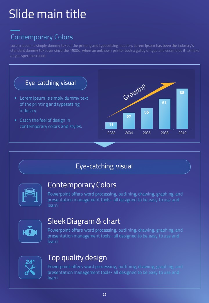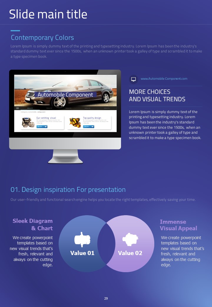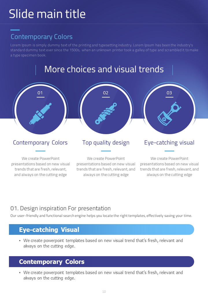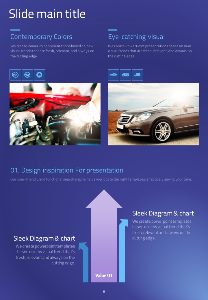 이 세로형 템플릿은 자동차 부품 관련 발표 자료를 위해 설계되었습니다. 모던한 보라색과 파란색 조합으로 시각적으로 매력적이며, 다양한 자동차 관련 데이터를 효과적으로 시각화하는 데 적합합니다. 자동차 산업의 전문가, 엔지니어 및 프로젝트 매니저에게 특히 추천되는 템플릿입니다.