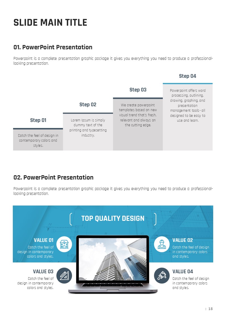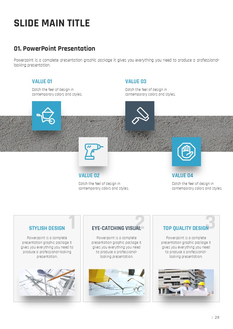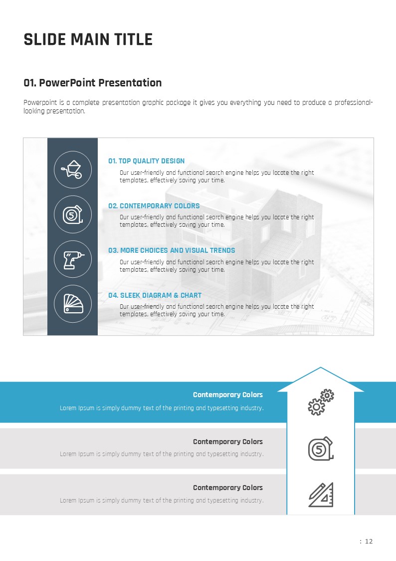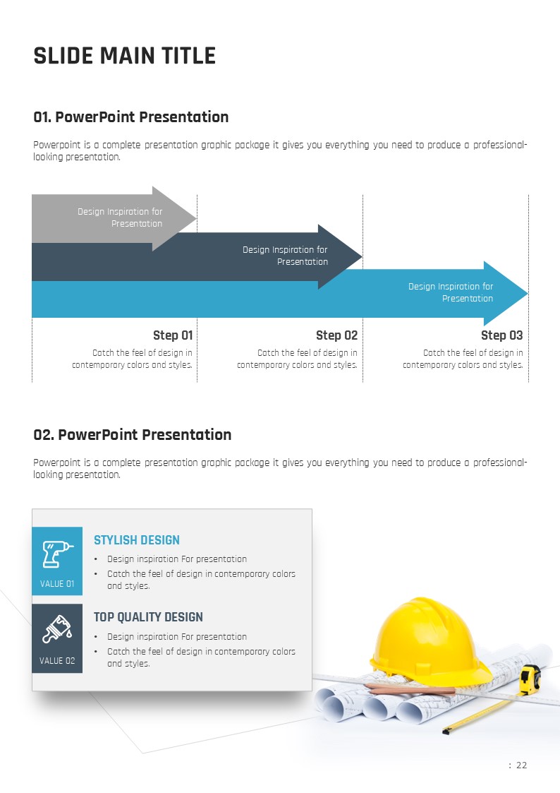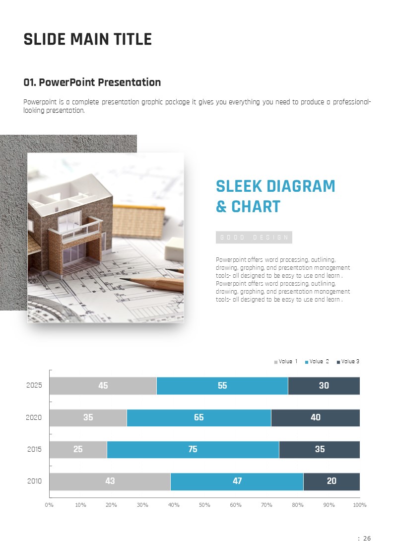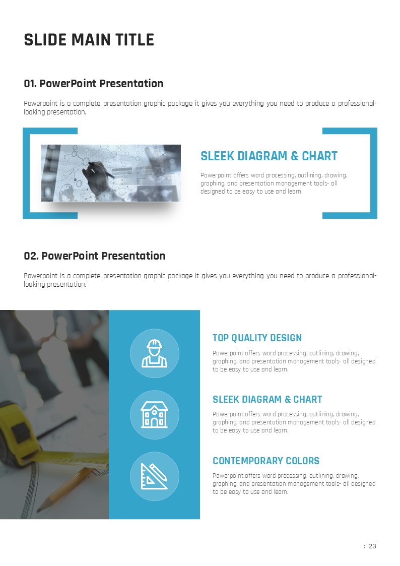 이 템플릿은 건설 및 부동산 분야에 이상적인 세로형 프레젠테이션 템플릿으로, 신뢰감 있는 디자인을 제공합니다. 시각적으로 매력적인 레이아웃은 주요 개념과 데이터를 효율적으로 전달할 수 있도록 구성되어 있으며, 제안서, 프로젝트 보고서, 기업 소개서 등에 활용하기에 최적화되어 있습니다. 건설기업, 기획자, 전문직 종사자에게 추천합니다.