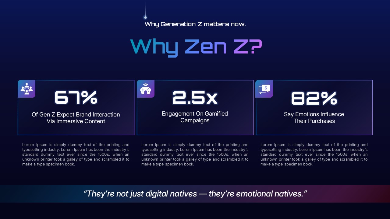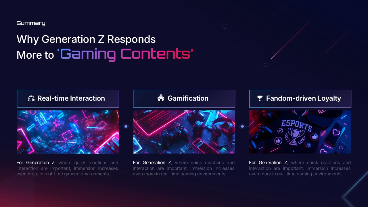 이 템플릿은 게임 산업에서의 브랜딩 전략을 위한 구성요소로, 특히 젊은 층을 겨냥한 감정 기반의 접근 방식을 강조합니다. 눈길을 사로잡는 비주얼과 창의적인 레이아웃은 플레이어와 브랜드 간의 몰입감을 증대시키며, 게임 마케팅 전략 및 프레젠테이션에 활용되기에 적합합니다. 크리에이티브 팀, 마케팅 전문가 및 스타트업 등 창의적인 콘텐츠 제작자에게 이상적인 선택이 될 것입니다.