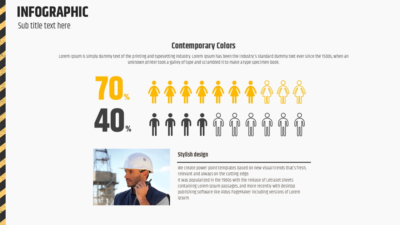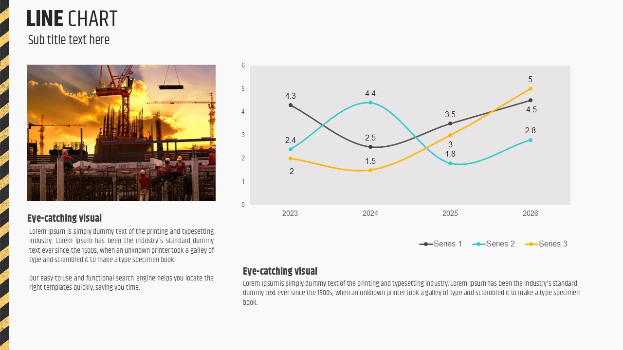 이 템플릿은 건축 프로젝트 발표, 현장 진행 상황 보고, 또는 건설 관련 프레젠테이션에 적합한 구성입니다. 강렬한 노란색과 세련된 그래픽 디자인이 특징이며, 다양한 차트와 인포그래픽을 포함해 복잡한 데이터를 효과적으로 전달할 수 있습니다. 건설 기업, 프로젝트 매니저, 부동산 전문가는 물론, 투자 유치 발표에도 최적화되어 있습니다.
