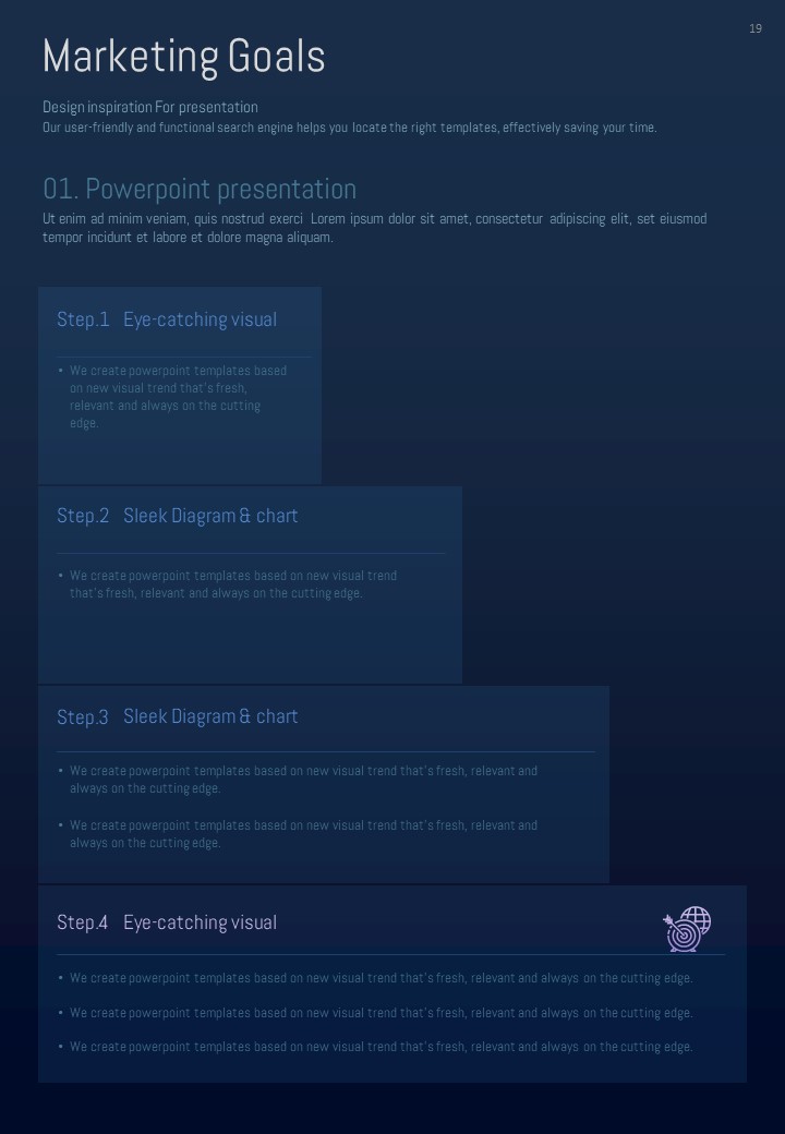 이 임팩트 마케팅 기획서 세로형 템플릿은 세련된 디자인과 강렬한 비주얼을 통해 마케팅 전략을 효과적으로 전달합니다. 세로형 레이아웃은 모바일 기기에서도 최적화되어 있어 인쇄용 및 제출용 프레젠테이션에도 적합하며, 다양한 마케팅 계획에 활용할 수 있습니다. 특히 기업의 마케팅 부서, 스타트업의 마케팅 팀 및 크리에이티브 전문가에게 추천합니다. 이 템플릿은 고객 세분화, 경쟁 분석, 제품/서비스 정의 등 다양한 프레젠테이션 흐름을 지원하여 실질적이고 설득력 있는 자료를 만들 수 있도록 도와줍니다.